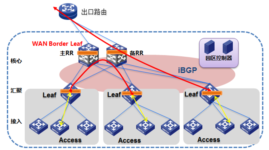 整個工廠網絡由核心、匯聚、接入三層設備組成,再搭配園區SDN控制器。其中接入層設備部署在生產線附近,而匯聚、核心設備之間則構建overlay網絡,同時采用分布式L3網關并通過可靠機制來抑制廣播風暴。接入層設備采用不同的VLAN進行接入位置的標識,通過TRUNK的方式上行到匯聚層,匯聚層完成VLAN到VxLAN的映射。