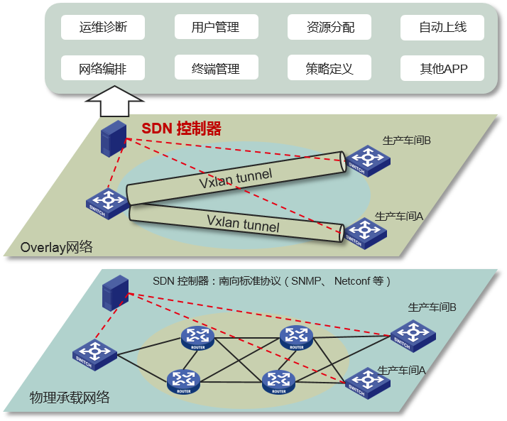 ? 核心匯聚層:本次方案采用SDN VxLAN技術設計工廠內核心匯聚層網絡,網絡可以抽象為物理承載網絡和面向應用的Overlay網絡。這種網絡設計方式的兩大特征是柔性網絡和軟件定義。柔性一方面指網絡架構靈活,業務部署(應用/終端)與位置無關;另一方面指以人和業務應用為核心,所有網絡資源根據人和業務需要移動。軟件定義指基于SDN思想將網絡控制平面集中,實現網絡設備的自動部署、業務按需交付,將運維人員從重復勞動中解放出來。