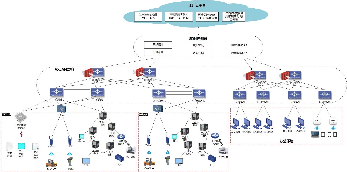 3) 基于SDN技術部署工廠網絡,向上對接工廠云平臺,實現網絡設備自動配置和業務快速部署,提升產線效率,減少人力投入。