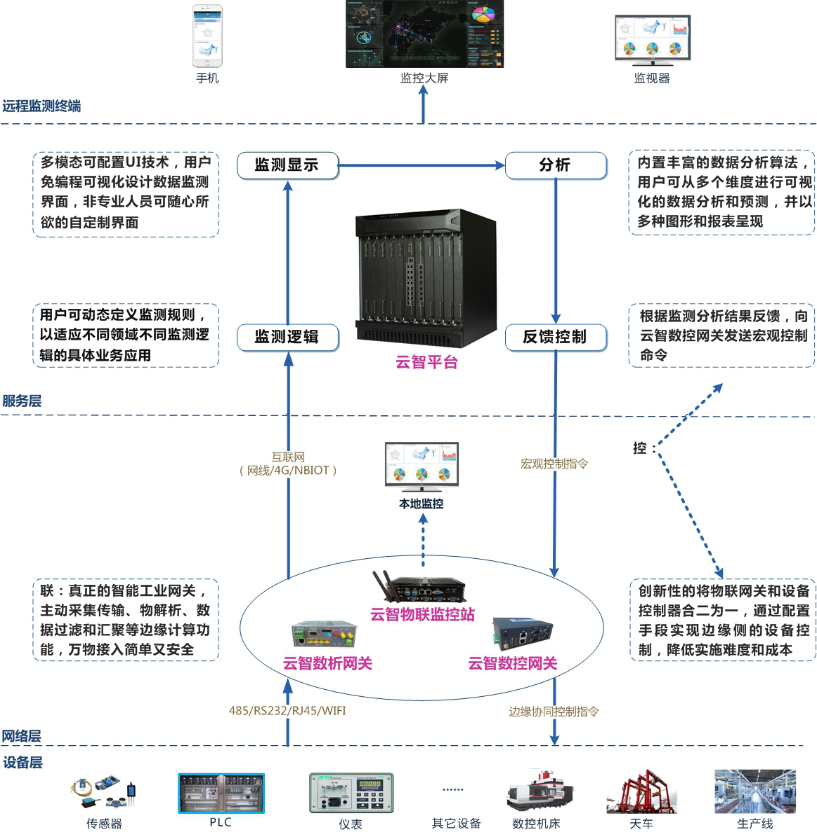 在“聯(lián)”方面,應(yīng)用邊緣計(jì)算理論,創(chuàng)新研發(fā)自主式物聯(lián)傳感技術(shù),開(kāi)發(fā)出真正的新一代智能工業(yè)網(wǎng)關(guān),具備異構(gòu)多型工業(yè)設(shè)備任意接入,主流工業(yè)協(xié)議動(dòng)態(tài)適配,特別是在網(wǎng)關(guān)層對(duì)從多路傳感器、控制器采集到的異構(gòu)多態(tài)數(shù)據(jù)進(jìn)行解析、過(guò)濾和匯聚數(shù)等邊緣計(jì)算功能,將這種計(jì)算通用化和智能化,輔以配置化手段以適應(yīng)于任何設(shè)備,免除應(yīng)用層的設(shè)備解析處理程序編寫,使設(shè)備上網(wǎng)入云即插即用,輕松安全。在“感”方面,構(gòu)建了首個(gè)免編程智能生成應(yīng)用的物聯(lián)感知平臺(tái),通過(guò)配置化、圖形化設(shè)計(jì)方式,快速實(shí)現(xiàn)設(shè)備在聯(lián)網(wǎng)監(jiān)測(cè)、狀態(tài)感知、聯(lián)動(dòng)報(bào)警、健康診斷及數(shù)據(jù)分析等功能的物聯(lián)網(wǎng)應(yīng)用系統(tǒng)。在“控”方面,創(chuàng)新性地將工業(yè)網(wǎng)關(guān)和設(shè)備控制器合二為一,內(nèi)置豐富控制算法,通過(guò)配置手段即可實(shí)現(xiàn)單設(shè)備的過(guò)程控制和多設(shè)備的協(xié)同控制,大幅降低物聯(lián)監(jiān)控網(wǎng)絡(luò)構(gòu)建難度和成本。