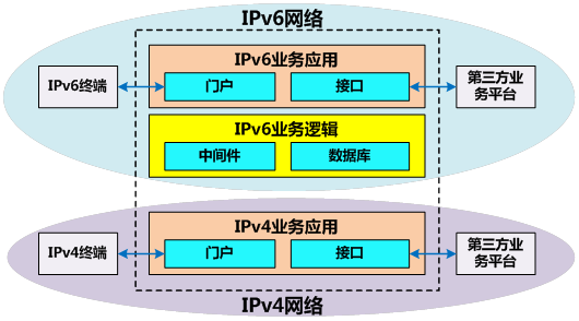 將業(yè)務(wù)平臺(tái)升級(jí)到IPv6后,IPv4和IPv6應(yīng)用將并存。如下圖所示,將IPv4業(yè)務(wù)平臺(tái)的部分應(yīng)用升級(jí)到IPv6,包括對(duì)外門戶和接口、核心業(yè)務(wù)邏輯,同時(shí)為了兼容IPv4用戶以及其它相關(guān)系統(tǒng),保留原有IPv4業(yè)務(wù)平臺(tái)的對(duì)外門戶和接口暫時(shí)不變,核心業(yè)務(wù)交由IPv6核心業(yè)務(wù)邏輯處理。升級(jí)完成后,IPv4對(duì)外門戶和接口為IPv4用戶提供服務(wù),IPv6對(duì)外門戶和接口為IPv6用戶提供服務(wù),核心業(yè)務(wù)邏輯升級(jí)成IPv6實(shí)現(xiàn)共用。