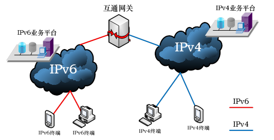 在IPv4向IPv6的演進(jìn)過程中,為保證業(yè)務(wù)平臺(tái)的平滑、穩(wěn)定演進(jìn),可以采用三種方案:第一種是互通網(wǎng)關(guān)方案,保持業(yè)務(wù)平臺(tái)現(xiàn)有結(jié)構(gòu)不變,通過分別在IPv4和IPv6的網(wǎng)絡(luò)邊界部署網(wǎng)關(guān)設(shè)備,利用IPv4/IPv6翻譯技術(shù)接入IPv6用戶;第二種是IPv4和IPv6應(yīng)用并存方案,業(yè)務(wù)平臺(tái)中IPv4和IPv6應(yīng)用并存,使得平臺(tái)具備同時(shí)支持IPv4和IPv6的功能;第三種是全面升級(jí)方案,完成全業(yè)務(wù)平臺(tái)以及周邊系統(tǒng)IPv6升級(jí),同時(shí)要求在IPv4網(wǎng)絡(luò)停止運(yùn)營前,基于IPv4的業(yè)務(wù)平臺(tái)需要繼續(xù)支持IPv4用戶。