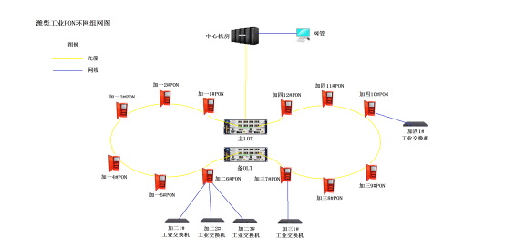 4) OLT通過n*GE上聯接口連接到中心機房,工業PON網絡將各生產設備端口透傳到網管上的管理平臺,對所有設備統一管理。