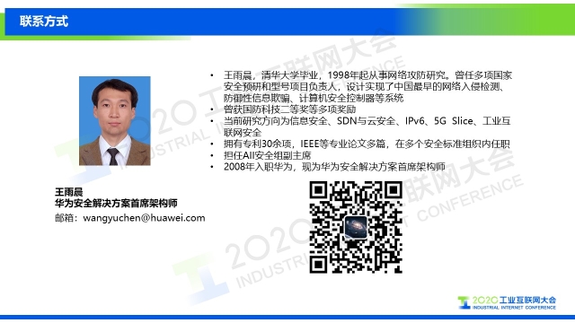 8月30日下午,在2020工業互聯網大會“工業互聯網安全”主題論壇上,華為技術有限公司安全領域解決方案首席架構師王雨晨以《工業互聯網安全體系建設——半導體高端制造業安全實踐》為題作演講,分享了華為在工業互聯網安全體系建設方面的經驗,以及華為在半導體高制造行業的應用實踐。