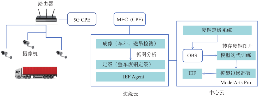 邊緣云部署AI推理應(yīng)用,中心云用于模型訓(xùn)練。中心云和邊緣云之間通過智能邊緣平臺(tái)(Intelligent EdgeFabric,IEF)解決方案(見圖2)實(shí)現(xiàn)邊云協(xié)同。