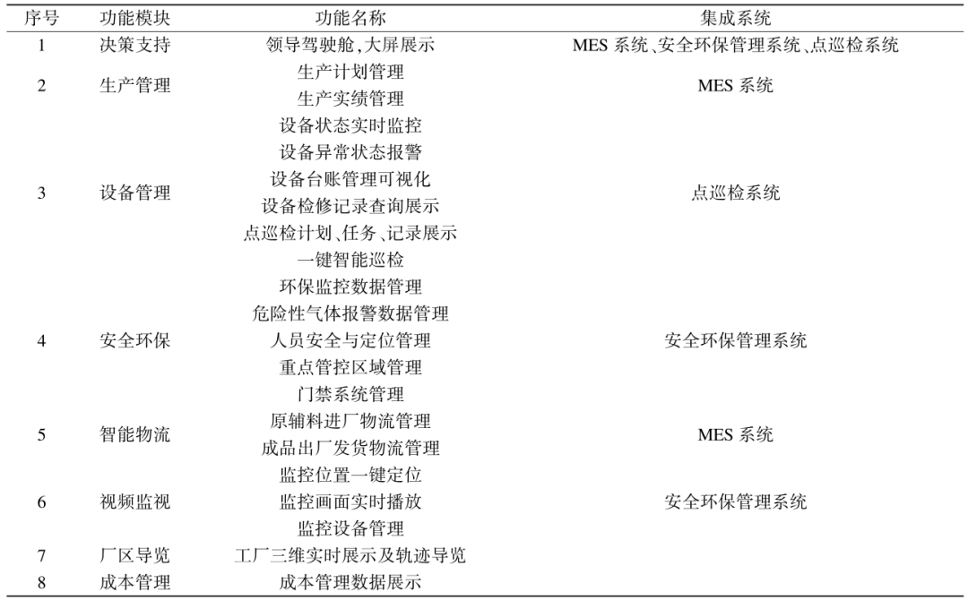 工廠數(shù)據(jù)平臺(tái)主要集成三方面數(shù)據(jù),即基礎(chǔ)數(shù)據(jù)、生產(chǎn)運(yùn)行數(shù)據(jù)和管理數(shù)據(jù)。在集成數(shù)據(jù)平臺(tái)的基礎(chǔ)上,開發(fā)了生產(chǎn)工藝、設(shè)備與點(diǎn)巡檢、安全環(huán)保、智能物流、視頻監(jiān)控、廠區(qū)導(dǎo)覽、成本管理等八大功能模塊,具體功能如表1所示。