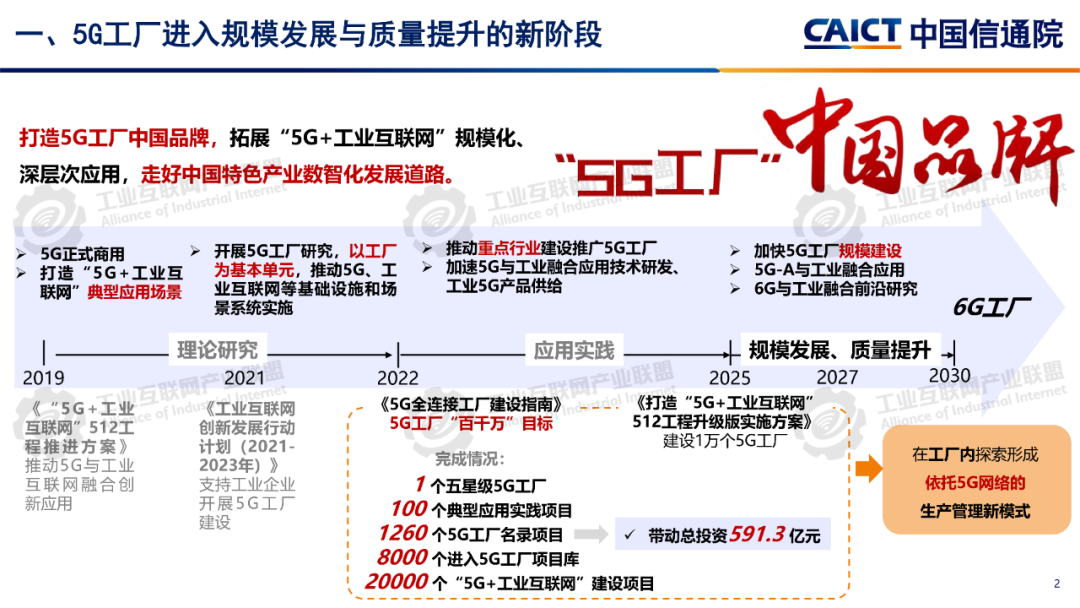 報告認為,5G工廠作為拓展“5G+工業互聯網”規模化、深層次應用的重要載體,通過理論研究、應用實踐,已進入規模發展與質量提升的新階段,在工廠內形成了依托5G網絡的生產管理新模式。近年來,工業和信息化部打造5G工廠中國品牌,探索中國特色產業數智化發展道路,依據《5G全連接工廠建設指南》要求,實施“百千萬”行動,目前全國“5G+工業互聯網項目”超過2萬個,其中1260個項目收入《5G工廠名錄》,形成了100個典型應用實踐,打造了1個五星級5G工廠,全面完成“十四五”時期工作目標。