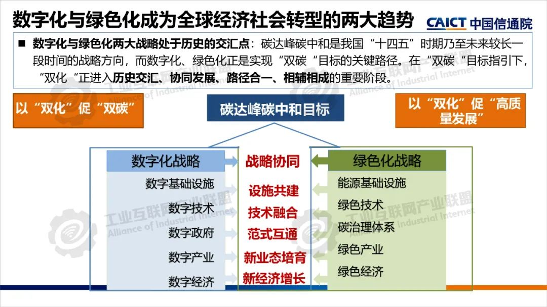 本期為您帶來由中國(guó)信息通信研究院產(chǎn)業(yè)與規(guī)劃研究所高級(jí)工程師王婧媛分享的《數(shù)字化綠色化協(xié)同轉(zhuǎn)型綜合試點(diǎn)建設(shè)解讀》。數(shù)字化轉(zhuǎn)型和綠色化轉(zhuǎn)型不僅是當(dāng)今世界發(fā)展的兩大主題,也是相互依存、相互促進(jìn)的孿生體。“雙化協(xié)同”是指數(shù)字化與綠色化兩大戰(zhàn)略相互協(xié)同、相互促進(jìn),在數(shù)字化轉(zhuǎn)型中同步實(shí)現(xiàn)綠色化,以綠色化帶動(dòng)數(shù)字化,在綠色化轉(zhuǎn)型中充分發(fā)揮數(shù)字化賦能作用,大力發(fā)展綠色數(shù)字融合新技術(shù),培育綠色數(shù)字產(chǎn)業(yè)新生態(tài)。