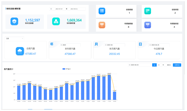 針對該園區(qū)蒸汽使用的情況,為每一臺蒸汽鍋爐安裝蒸汽流量傳感器和邊緣智傳網(wǎng)關(guān),在蒸汽使用的廠房入口的位置也同樣部署傳感器和網(wǎng)關(guān),結(jié)合自主開發(fā)的IoT能源監(jiān)測管理平臺,對軟硬件進行了快速的部署,實現(xiàn)了全園區(qū)蒸汽生產(chǎn)與使用的在線監(jiān)管,精準(zhǔn)實現(xiàn)了蒸汽生產(chǎn)量、使用量、使用率、損失率、能源利用率等數(shù)據(jù)的統(tǒng)計。