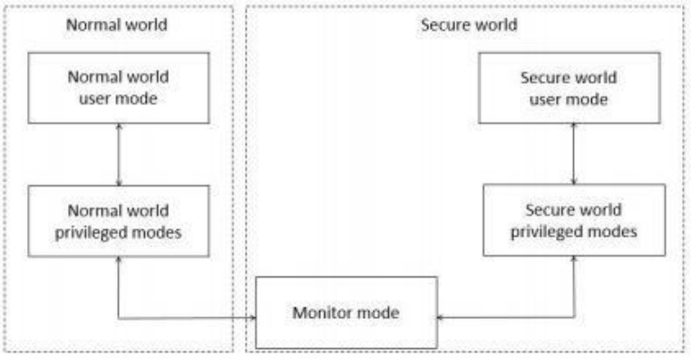 兩個(gè)虛擬核以基于時(shí)間片的方式運(yùn)行,根據(jù)需要實(shí)時(shí)占用物理核,并通過(guò)MonitorMode在安全世界和非安全世界之間切換,類(lèi)似同一CPU下的多應(yīng)用程序環(huán)境,不同的是多應(yīng)用程序環(huán)境下操作系統(tǒng)實(shí)現(xiàn)的是進(jìn)程間切換,而Trustzone下的MonitorMode實(shí)現(xiàn)同一CPU上兩個(gè)操作系統(tǒng)間的切換。