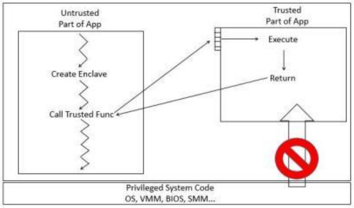 SGX允許用戶(hù)態(tài)及內(nèi)核態(tài)代碼定義將特定內(nèi)存區(qū)域,設(shè)置為私有區(qū)域,此區(qū)域也被稱(chēng)為飛地(Enclave)。其內(nèi)容受到保護(hù),不能被本身以外的任何進(jìn)程存取,包括高權(quán)限級(jí)別運(yùn)行的進(jìn)程(例如操作系統(tǒng)內(nèi)核進(jìn)程)。