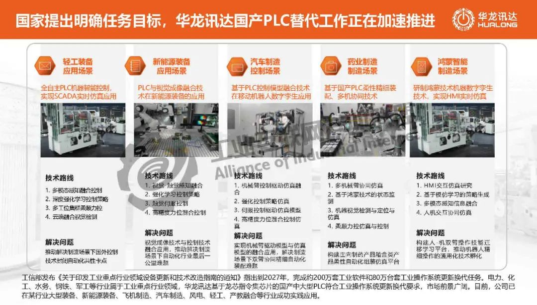 龍小昂介紹,工信部發布《關于印發工業重點行業領域設備更新和技術改造指南的通知》指出到2027年,完成約200萬套工業軟件和80萬臺套工業操作系統更新換代任務。電力、化工、水務、鋼鐵、軍工等行業屬于工業重點行業領域,華龍訊達基于龍芯指令集芯片的國產中大型PLC符合工業操作系統更新換代要求,已在某行業大型裝備、新能源裝備、飛機制造、汽車制造、風電、輕工、產教融合等行業成功實踐應用。