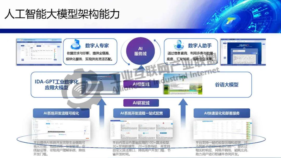 袁雪騰介紹,智能技術(shù)處于創(chuàng)新迭代與落地應(yīng)用的密集爆發(fā)期,需把握未來5到15年技術(shù)成熟并向產(chǎn)業(yè)滲透的歷史交匯點(diǎn)。人工智能將成為未來智能制造創(chuàng)新發(fā)展的關(guān)鍵技術(shù)變量,為未來智能制造帶來真正核心驅(qū)動(dòng)力。人工智能大模型架構(gòu)能力能進(jìn)一步降低AI應(yīng)用開發(fā)門檻,實(shí)現(xiàn)AI場(chǎng)景落地一站式服務(wù)。