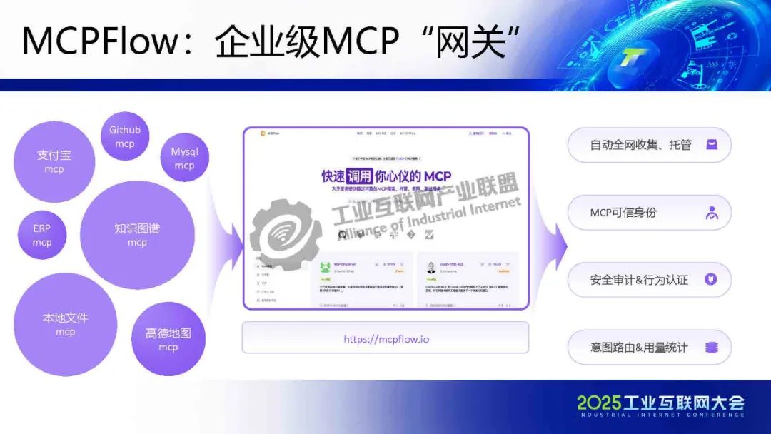 賀松介紹,基于MCP協議的AI落地解決方案,解決企業數字化轉型兩大痛點:1)業務語境缺失——通過標準化接口注入訂單狀態、客戶信息等上下文,使大模型精準理解業務語義;2)數據孤島問題——MCPFlow平臺集成ERP、CRM等系統工具鏈,實現"搭積木式"AI服務調用,將開發周期縮短70%。結合中國信通院"星火鏈網"構建可信AI智能體交換中心(ASP),確保內外數據安全互通。該方案推動大模型從概念走向業務控制,實現人機協同決策,形成開放AI生態