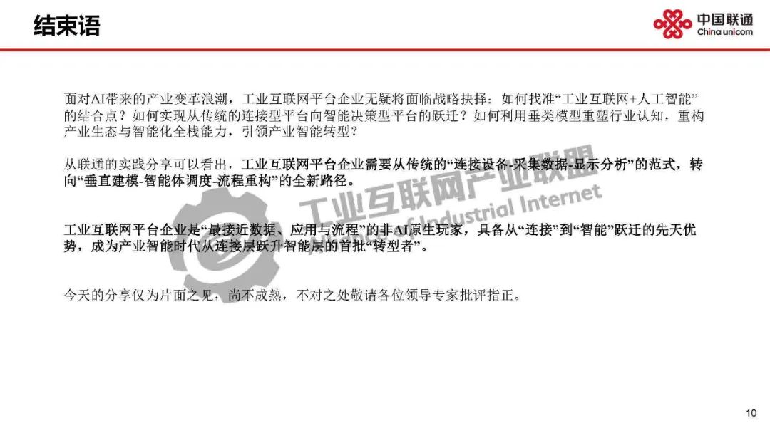 范濟(jì)安介紹,面對(duì)AI帶來(lái)的產(chǎn)業(yè)變革浪潮,工業(yè)互聯(lián)網(wǎng)平臺(tái)企業(yè)無(wú)疑將面臨戰(zhàn)略抉擇。從聯(lián)通的實(shí)踐分享可以看出,工業(yè)互聯(lián)網(wǎng)平臺(tái)企業(yè)需要從傳統(tǒng)的“連接設(shè)備-采集數(shù)據(jù)-顯示分析”的范式,轉(zhuǎn)向“垂直建模-智能體調(diào)度-流程重構(gòu)”的全新路徑。工業(yè)互聯(lián)網(wǎng)平臺(tái)企業(yè)是“最接近數(shù)據(jù)、應(yīng)用與流程”的非AI原生玩家,具備從“連接”到“智能”躍遷的先天優(yōu)勢(shì),成為產(chǎn)業(yè)智能時(shí)代從連接層躍升智能層的首批“轉(zhuǎn)型者”。