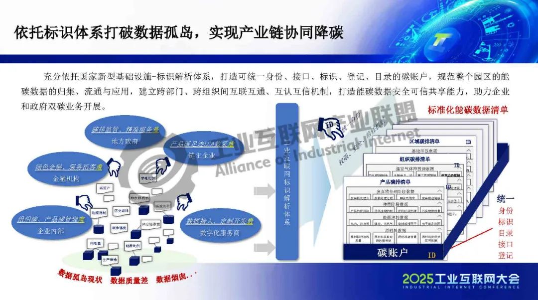 在園區建設方面,標識體系作為工信部推動全行業互聯互通的核心基礎設施,承擔著打破行業壁壘、賦能企業數字化升級的重要使命。一方面,依托標識體系,可以為企業、產品和設備賦予統一、可信的數字身份,實現數據的精準溯源與全流程管理,為能源效率提升和碳資產增值管理提供有力支撐,從而釋放園區運營成本優化空間。另一方面,標識體系有助于打通企業內部及產業鏈上下游的信息壁壘,破解數據孤島,進一步提升供應鏈的低碳協同效率。