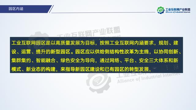 工業(yè)互聯(lián)網(wǎng)園區(qū)是以高質(zhì)量發(fā)展為目標,按照工業(yè)互聯(lián)網(wǎng)內(nèi)涵要求,規(guī)劃、建設(shè)、運營、提升的新型園區(qū)。園區(qū)建設(shè)應(yīng)以供給側(cè)結(jié)構(gòu)性改革為主線,以協(xié)同創(chuàng)新、集群集約、智能融合、綠色安全為導(dǎo)向,通過網(wǎng)絡(luò)、平臺、安全三大體系和新模式、新業(yè)態(tài)的構(gòu)建,來指導(dǎo)新園區(qū)建設(shè)和已有園區(qū)的轉(zhuǎn)型發(fā)展。