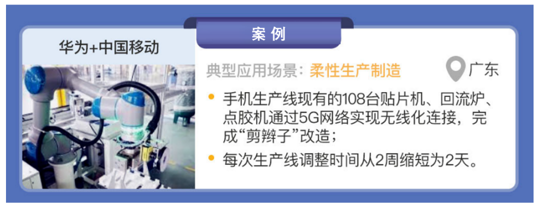 華為與中國移動合作,在廣東省松山湖工廠利 8 用 5G 技術實現了柔性生產制造場景的應用。華為松山湖工廠原有手機生產車間需要布線9 萬米,每條生產線平均擁有186 臺設備,生產線每半年隨新手機機型的更新需要進行升級和調整,物料變更、工序增減等要求車間所有網線的重新布放,每次調整需要停工 2 周,以每28 秒一部手機計算,一天停工影響產值達 1000 多萬。通過5G 與工業互聯網的融合應用,華為松山湖工廠把生產線現有的108 臺貼片機、回流爐、點膠機通過 5G 網絡實現無線化連接,完成“剪辮子”改造,每次生產線調整時間從2 周縮短為2 天。同時,在手機組裝過程中的點隔熱膠、打螺釘、手機貼膜、打包封箱等工位部署視覺檢測相機,通過5G 網絡連接,把圖片或視頻發送到部署在 MEC 上的(人工智能)AI 模塊中進行訓練,一方面多線共享樣本后縮短了模型訓練周期,另一方面實現了從“多步一檢”到“一步一檢”模式改變,及時發現產品質量問題。