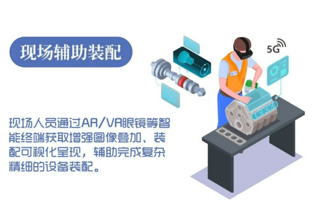 通過內置 5G 模組或部署5G網關等設備,實現(xiàn) AR/VR 眼鏡、智能手機、PAD 等智能終端的5G網絡接入,采集現(xiàn)場圖像、視頻、聲音等數據,通過5G網絡實時傳輸至現(xiàn)場輔助裝配系統(tǒng),系統(tǒng)對數據進行分析處理,生成生產 4 輔助信息,通過 5G 網絡下發(fā)至現(xiàn)場終端,實現(xiàn)操作步驟的增強圖像疊加、裝配環(huán)節(jié)的可視化呈現(xiàn),幫助現(xiàn)場人員進行復雜設備或精細化設備的裝配。另外,專家的指導信息、設備操作說明書、圖紙、文件等也可以通過5G網絡實時同步到現(xiàn)場終端,現(xiàn)場裝配人員簡單培訓后即可上崗,有效提升現(xiàn)場操作人員的裝配水平,實現(xiàn)裝配過程智能化,提升裝配效率。