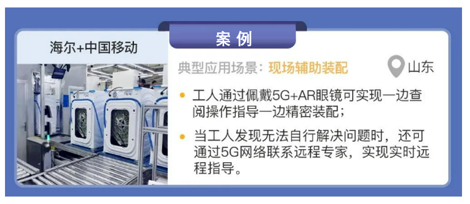 海爾與中國移動合作,在山東省青島市利用5G技術實現(xiàn)了精密工業(yè)裝備的現(xiàn)場輔助裝配場景的應用。青島海爾家電工廠結合海爾卡奧斯工業(yè)互聯(lián)網平臺,打造基于5G+MEC 的互聯(lián)工廠,開展了基于AR 眼鏡的5G遠程輔助裝配,工人通過佩戴 AR 眼鏡采集關鍵工業(yè)裝備的現(xiàn)場視頻,同時從后臺系統(tǒng)調取產品安裝指導推送到AR眼鏡上,實現(xiàn)了一邊查閱操作指導一邊裝配的目的。當工人發(fā)現(xiàn)無法自行 9 解決問題時,還可以通過 5G 網絡聯(lián)系遠程專家,實現(xiàn)實時遠程指導。另外,通過將算力部署在MEC 側,降低了AR眼鏡算力要求與眼鏡重量,實現(xiàn)數據的本地計算,保障視頻數據不出園區(qū),一方面解決了以往Wi-Fi 連接產生的信號不穩(wěn)定、暈眩感和 AR 眼鏡偏重的困擾,另一方面也節(jié)省了維修時間和成本。