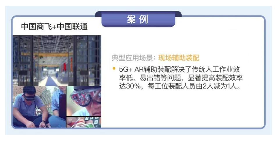 中國商飛與中國聯(lián)通合作,在上海浦東新區(qū)開展了“5G+工業(yè)互聯(lián)網賦能大飛機智能制造”項目建設,搭建了 5 座宏基站和 150 余套室分小站,實現(xiàn)了現(xiàn)場輔助裝配場景的應用。在現(xiàn)場輔助裝配方面,商飛在裝配車間中存在大量飛機線纜連接器裝配工作的工位,通過引入 5G+AR 輔助裝配系統(tǒng),工人利用AR虛擬信息實現(xiàn)虛實疊加,根據顯示的指導畫面完成裝配操作。通過 5G 高速率和低時延特性,讓工人準確、快速地對 12 線纜連接器進行查找和裝配,并保障數據的有效性,解決了傳統(tǒng)人工作業(yè)效率低、容易出錯等問題,顯著提高了裝配效率達 30%,每工位所需裝配人員由2 人減少為1 人。