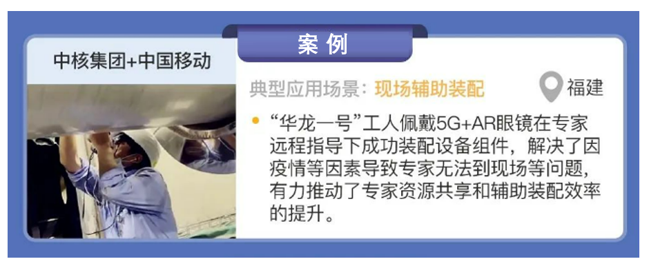 中核集團與中國移動合作,在福建省福清開展5G+核電項目建設,實現(xiàn)了現(xiàn)場輔助裝配場景的應用。在“華龍一號”六號機組的裝配建設現(xiàn)場,通過5G專網+AR等技術,工人佩戴 AR 眼鏡在專家遠程指導下成功裝配設備組件,解決了因疫情等因素導致專家無法到現(xiàn)場等問題,有力推動了專家資源共享和輔助裝配效率的提升。