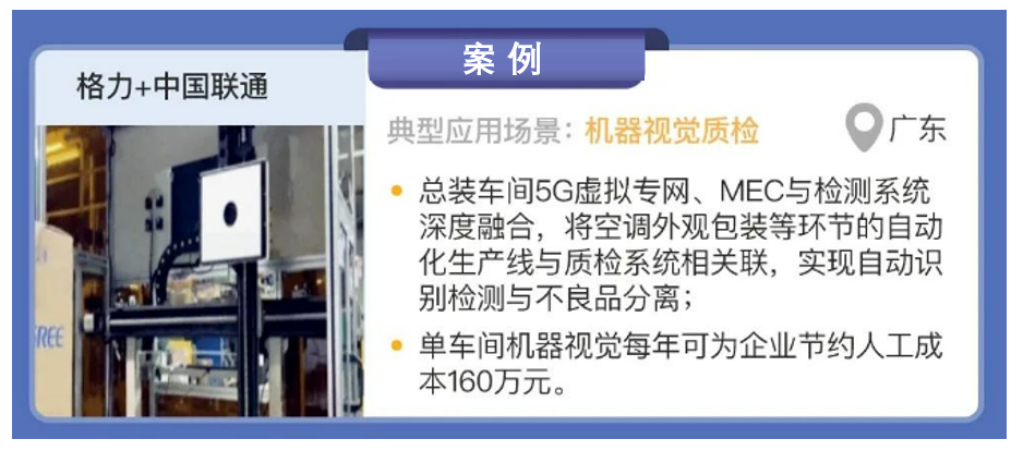 格力與中國聯(lián)通合作,在廣東省利用5G技術(shù)部署了機(jī)器視覺質(zhì)檢場景的應(yīng)用。在格力電器的總裝車間,聯(lián)通以一套獨立 MEC 為格力打造了工業(yè)虛擬專網(wǎng),實現(xiàn)生產(chǎn)控制網(wǎng)與生產(chǎn)管理網(wǎng)融合,在模擬場景中基于樣本訓(xùn)練建立數(shù)據(jù)模型,在需要自動檢測的工位上安裝5G高清攝像頭,與自動化生產(chǎn)線同頻聯(lián)調(diào),在實際生產(chǎn)中利用5G網(wǎng)絡(luò)將待檢內(nèi)容自動拍照,照片視頻流上傳至部署在MEC平臺的機(jī)器視覺質(zhì)檢應(yīng)用,運用圖形處理單元(GPU)大算力資源與數(shù)據(jù)模型做實時比對分析檢查,實現(xiàn)設(shè)備自動識別,檢測結(jié)果以毫秒級時延返回現(xiàn)場端,自動化生產(chǎn)線與質(zhì)檢系統(tǒng)關(guān)聯(lián)做出不良品分離操作。5G 虛擬專網(wǎng)、MEC 平臺與檢測系統(tǒng)深度融合,為機(jī)器視覺質(zhì)檢應(yīng)用的數(shù)據(jù)傳輸和信息處理提供了強(qiáng)大保障。目前格力已在其總部總裝生產(chǎn)線的空調(diào)外觀包裝、壓縮機(jī)線序、空調(diào)自動電氣安全測試等環(huán)節(jié)中部署了5G機(jī)器視覺質(zhì)檢應(yīng)用,單車間機(jī)器視覺每年可為企業(yè)節(jié)約人工成本 160 萬元。