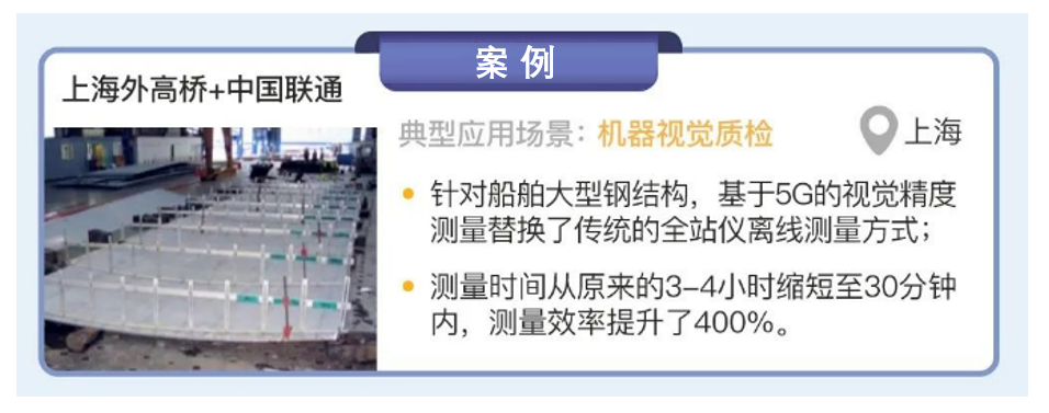 上海市外高橋造船有限公司與中國聯(lián)通合作,在上海市開展“5G+工業(yè)互聯(lián)網(wǎng)”在船舶行業(yè)的落地應(yīng)用,搭建 5G 專網(wǎng),融合 MEC 技術(shù),實現(xiàn)了基于5G的機(jī)器視覺檢測場景的應(yīng)用。使用工業(yè)相機(jī)+靶點的測量模式進(jìn)行大型鋼結(jié)構(gòu)精度測量,通過 5G 專網(wǎng)及邊緣云,實時回傳、解算現(xiàn)場拍攝圖片,生成點位文件。基于5G 的視覺精度測量替換了傳統(tǒng)的全站儀離線測量方式,將測量時間從原來的3-4小時,縮短至 30 分鐘內(nèi),測量效率提升了400%。