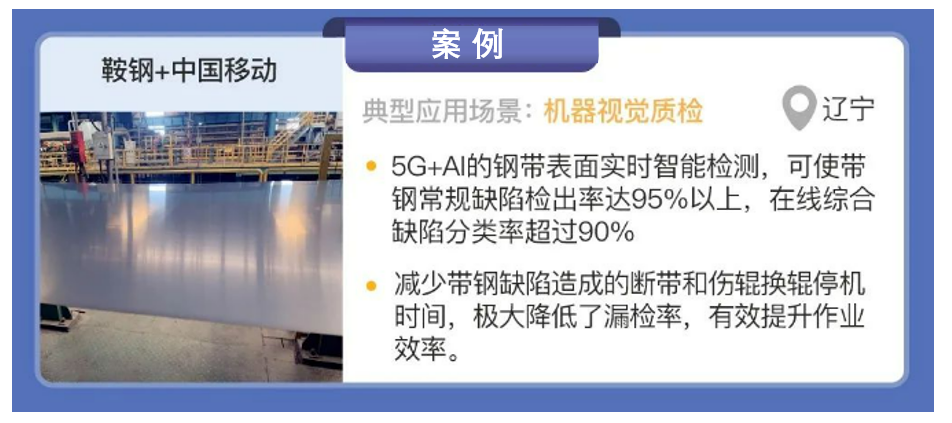 鞍鋼與中國移動合作,在遼寧省開展了“基于5G 的機(jī)器視覺帶鋼表面檢測平臺研發(fā)與應(yīng)用”項目建設(shè),實現(xiàn)了機(jī)器視覺質(zhì)檢場景的應(yīng)用。在機(jī)器視覺質(zhì)檢方面,通過部署工業(yè)相機(jī)拍攝高清圖片、采集質(zhì)檢數(shù)據(jù),利用 5G 網(wǎng)絡(luò)將采集到的冷軋現(xiàn)場4K/8K等高清圖像數(shù)據(jù)回傳至操作室平臺,通過平臺的視覺AI 分析能力對圖像進(jìn)行處理分析,完成帶鋼表面缺陷的實時檢測;同時,帶鋼軋制速度極高,通過帶鋼表面的反光斑馬條紋反饋帶鋼的平整度,用于帶鋼生產(chǎn)質(zhì)量的實時檢測,為張力輥等調(diào)節(jié)提供依據(jù)。方案部署完成后,帶鋼常規(guī)缺陷檢出率達(dá)95%以上,在線綜合缺陷分類率超過 90%,提高成材率的同時減少了帶鋼缺陷造成的斷帶和傷輥換輥停機(jī)時間。