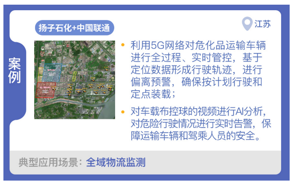 中國(guó)石化揚(yáng)子石油化工有限公司與中國(guó)聯(lián)通合作,開(kāi)展了“5G+安全石化”項(xiàng)目建設(shè),實(shí)現(xiàn)了全域物流監(jiān)測(cè)場(chǎng)景的應(yīng)用。利用5G+北斗技術(shù),實(shí)現(xiàn)生產(chǎn)區(qū)內(nèi)危化品車輛的高精度定位,并實(shí)時(shí)傳輸至危化品運(yùn)輸管控平臺(tái)。平臺(tái)對(duì)進(jìn)入揚(yáng)子生產(chǎn)區(qū)的危化品車輛進(jìn)行全過(guò)程、實(shí)時(shí)管控,基于定位數(shù)據(jù)形成行駛軌跡,進(jìn)行偏離預(yù)警,有效保證危化品車輛按照規(guī)定路線行駛和在規(guī)定地點(diǎn)裝載。通過(guò)5G網(wǎng)絡(luò)將車載布控球拍攝的視頻傳輸至邊緣云平臺(tái)進(jìn)行人工智能(AI)分析,對(duì)危化品車輛危險(xiǎn)行駛、路中障礙、前車距離過(guò)近等進(jìn)行實(shí)時(shí)告警,有效保障了運(yùn)輸車輛和駕乘人員的安全。