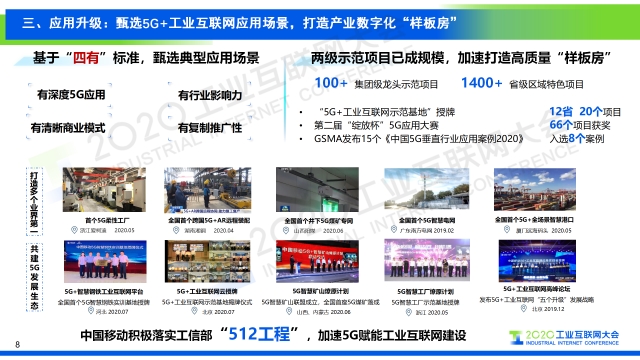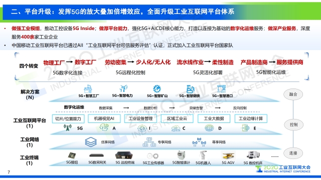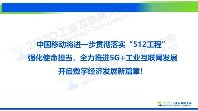 “工業(yè)互聯(lián)網(wǎng)是5G應(yīng)用范圍最廣、解決方案最成熟、價值提升最顯著的領(lǐng)域之一。5G不僅是運營商的5G,更是千行百業(yè)的5G。在推進‘5G+工業(yè)互聯(lián)網(wǎng)’創(chuàng)新發(fā)展的實踐中,中國移動緊抓新基建帶來的空前機遇,已通過5G垂直行業(yè)布局,初步形成了示范效應(yīng),并努力實施‘五個升級’策略,即加快網(wǎng)絡(luò)升級、平臺升級、應(yīng)用升級、模式升級和生態(tài)升級,推動‘5G+工業(yè)互聯(lián)網(wǎng)’加速發(fā)展。未來,中國移動將繼續(xù)深化貫徹落實‘512工程’,強化使命擔當,攜手各界合作伙伴,全力推進‘5G+工業(yè)互聯(lián)網(wǎng)’發(fā)展。”