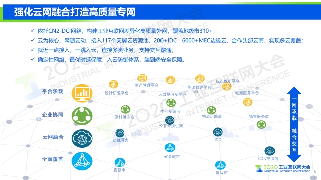 “業(yè)界普遍認(rèn)為,新基建,需要三大基礎(chǔ)設(shè)施,即,“5G+ 工業(yè)互聯(lián)網(wǎng)”的網(wǎng)絡(luò)設(shè)施、“人工智能+云計算”的新技術(shù)設(shè)施、“大數(shù)據(jù)技術(shù)+數(shù)據(jù)中心”的算力設(shè)施。中國電信將以云網(wǎng)融合為基,發(fā)揮自身優(yōu)勢,不斷完善上述三大基礎(chǔ)設(shè)施建設(shè),借助5G等多連接技術(shù)、隨選的混合多云、云間高速網(wǎng)絡(luò)等形成5G+NBIOT+MEC+ABCD+工業(yè)PON+CN2的云網(wǎng)基礎(chǔ)設(shè)施底座,為工業(yè)互聯(lián)網(wǎng)提供綜合的、定制化的云網(wǎng)融合服務(wù)。同時,中國電信將持續(xù)聚合國內(nèi)外工業(yè)互聯(lián)網(wǎng)平臺和應(yīng)用,與各界開展合作。”