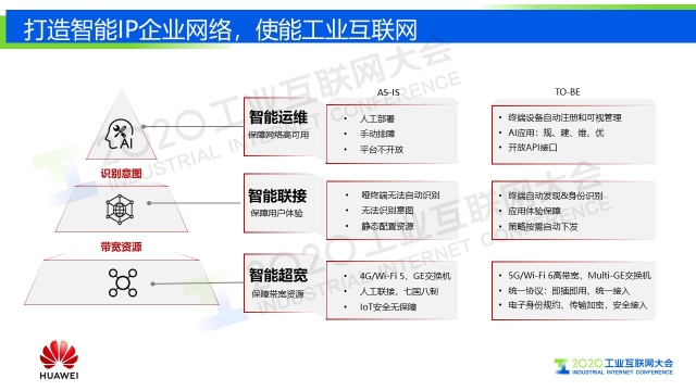 “未來的企業園區網絡應該具備三大特征,智能超寬、智能連接和智能運維。 智能超寬,對于網絡而言,這個超寬還必須有智能。以前是3G/4G、WIFI4/WIFI5,現在是5G、WIFI6,帶寬是原來的4倍以上;智能連接,以前只是連接起來,形成一個網絡,但未來的趨勢需要對園區的所有業務進行差異化;智能運維,借助于新的技術,大數據的分析以及AI,能夠把故障排查從以天/周為維度,變成按照分鐘級維度。”
