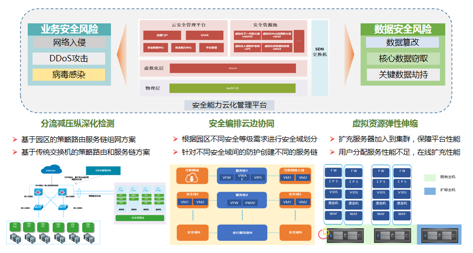 圍繞SDN、安全資源池、云安全管理平臺(tái)3大模塊,構(gòu)建云化網(wǎng)絡(luò)防護(hù)能力,安全能力部署在UPF近源側(cè),通過分流減壓縱深化檢、安全編排云邊協(xié)同、虛擬資源彈性伸縮多維度安全協(xié)同,為企業(yè)客戶打造專屬的安全解決方案,對(duì)企業(yè)網(wǎng)絡(luò)進(jìn)行全流量安全監(jiān)控,保障園區(qū)資產(chǎn)的安全訪問與使用。
