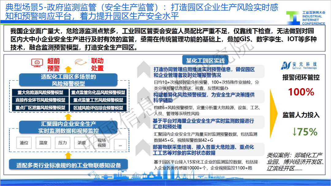 五是安全生產監管,針對危險源監測點繁多,工業園區管委會安監人員配比嚴重不足,線下檢查困難的問題,某服務商打造化工園區云平臺,部署超過10000個工業傳感器,實現園區內液位、溫度、壓力、濃度等數據的實時監測,同時適配作業環節、廠區泄露、工藝監管的模型,實現園區預警與處置。