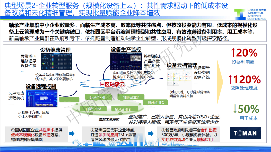 二是規模化設備上云,針對面向軸承產業集群中小企業數量多,設備停機率高的共性痛點,某服務商打造園區軸承云,提供設備遠程控制、設備健康管理、設備生產監控等一系列殺手锏應用,通過對設備的管控有效減少停機時間,使得軸承行業綜合成本較改造前下降12%,利潤率也從改造前的4%提升到了8%。