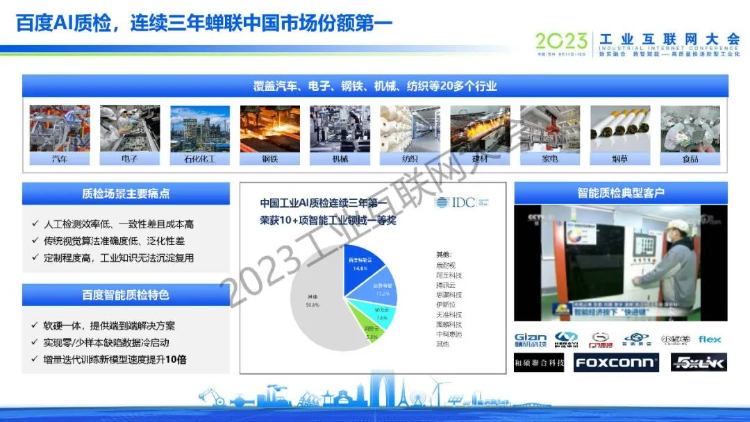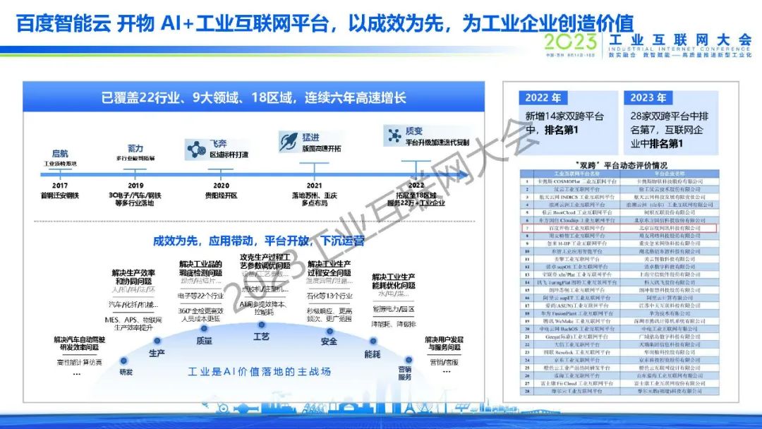 黃鋒表示,百度從2017年單一的AI質(zhì)檢場(chǎng)景開始,逐漸拓展到安全生產(chǎn)、能耗優(yōu)化、智能調(diào)度等場(chǎng)景,在生產(chǎn)、銷售、客戶服務(wù)、供應(yīng)鏈等環(huán)節(jié)都做了大量成功案例,同時(shí)從行業(yè)拓展到區(qū)域,和地方政府共建了多個(gè)工業(yè)互聯(lián)網(wǎng)產(chǎn)業(yè)基地,批量賦能當(dāng)?shù)禺a(chǎn)業(yè)和客戶企業(yè)。2017年到今天,百度開物工業(yè)互聯(lián)網(wǎng)實(shí)現(xiàn)了規(guī)模化增長(zhǎng),同時(shí)也得到了工信部的認(rèn)可,在2022年評(píng)為新增14家雙跨平臺(tái)第一名,2023年在所有互聯(lián)網(wǎng)企業(yè)中排名第一。未來也將繼續(xù)探索大模型技術(shù)在工業(yè)場(chǎng)景應(yīng)用,將自身沉淀出的工業(yè)AI技術(shù)沉淀為平臺(tái),和行業(yè)合作伙伴一同賦能客戶、產(chǎn)生價(jià)值,為工業(yè)互聯(lián)網(wǎng)的發(fā)展盡自己的一份力量。