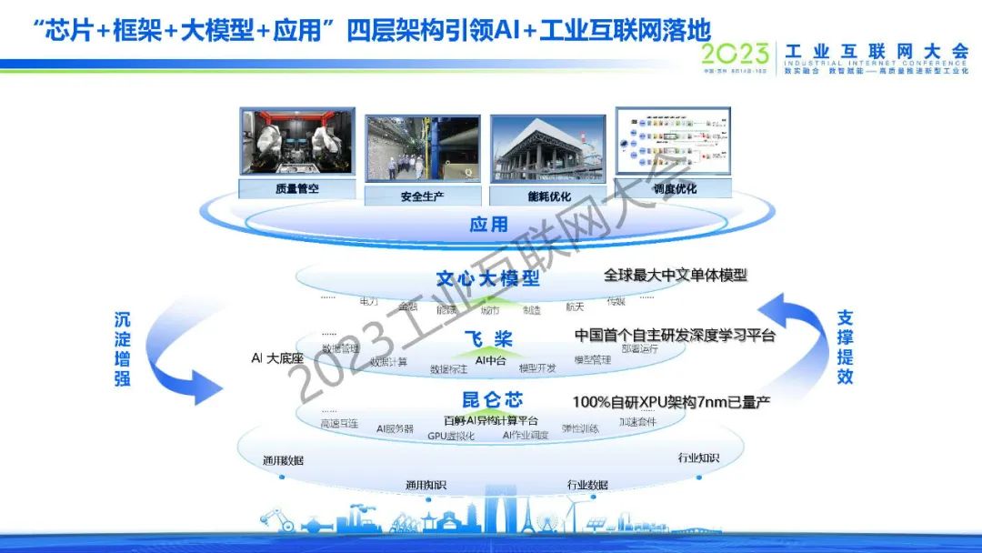 “從數(shù)據(jù)中挖掘出工業(yè)知識(shí),并在應(yīng)用中真正產(chǎn)生降本增效的價(jià)值,才是工業(yè)互聯(lián)網(wǎng)未來發(fā)展的趨勢(shì),從數(shù)據(jù)中挖掘知識(shí)就是AI擅長(zhǎng)的事。百度從2017年開始探索AI與工業(yè)互聯(lián)網(wǎng)的融合,秉承著“成效為先,應(yīng)用帶動(dòng),平臺(tái)開放,下沉運(yùn)營(yíng)”的發(fā)展理念,通過自主研發(fā)的“芯片+框架+大模型+應(yīng)用”四層架構(gòu),引領(lǐng)AI+工業(yè)互聯(lián)網(wǎng)在各個(gè)場(chǎng)景的落地。“