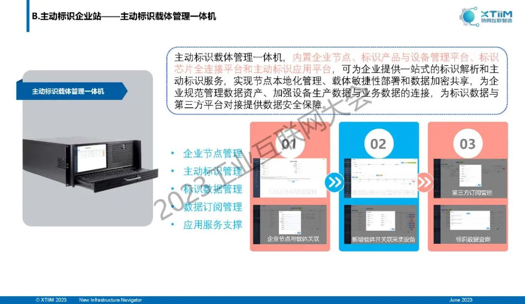 “主動標識載體管理一體機,內(nèi)置企業(yè)節(jié)點、標識產(chǎn)品與設(shè)備管理平臺、標識芯片全連接平臺和主動標識應(yīng)用平臺,可為企業(yè)提供一站式的標識解析和主動標識服務(wù),實現(xiàn)節(jié)點本地化管理、載體敏捷性部署和數(shù)據(jù)加密共享,為企業(yè)規(guī)范管理數(shù)據(jù)資產(chǎn)、加強設(shè)備生產(chǎn)數(shù)據(jù)與業(yè)務(wù)數(shù)據(jù)的連接,為標識數(shù)據(jù)與第三方平臺對接提供數(shù)據(jù)安全保障。”
