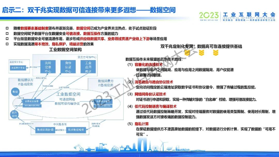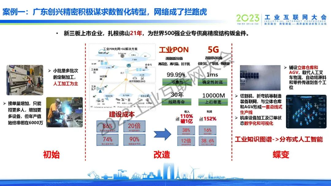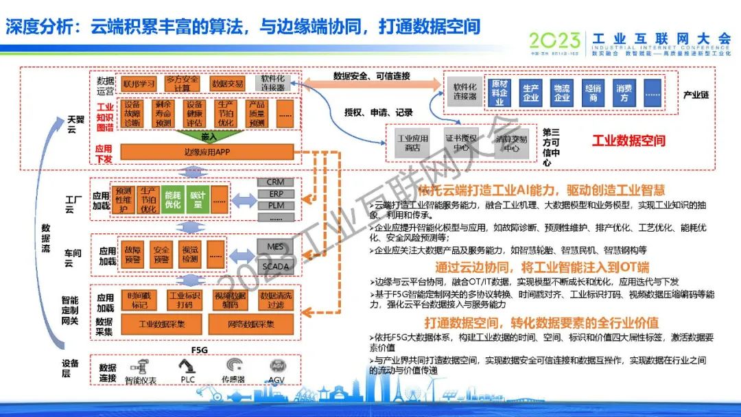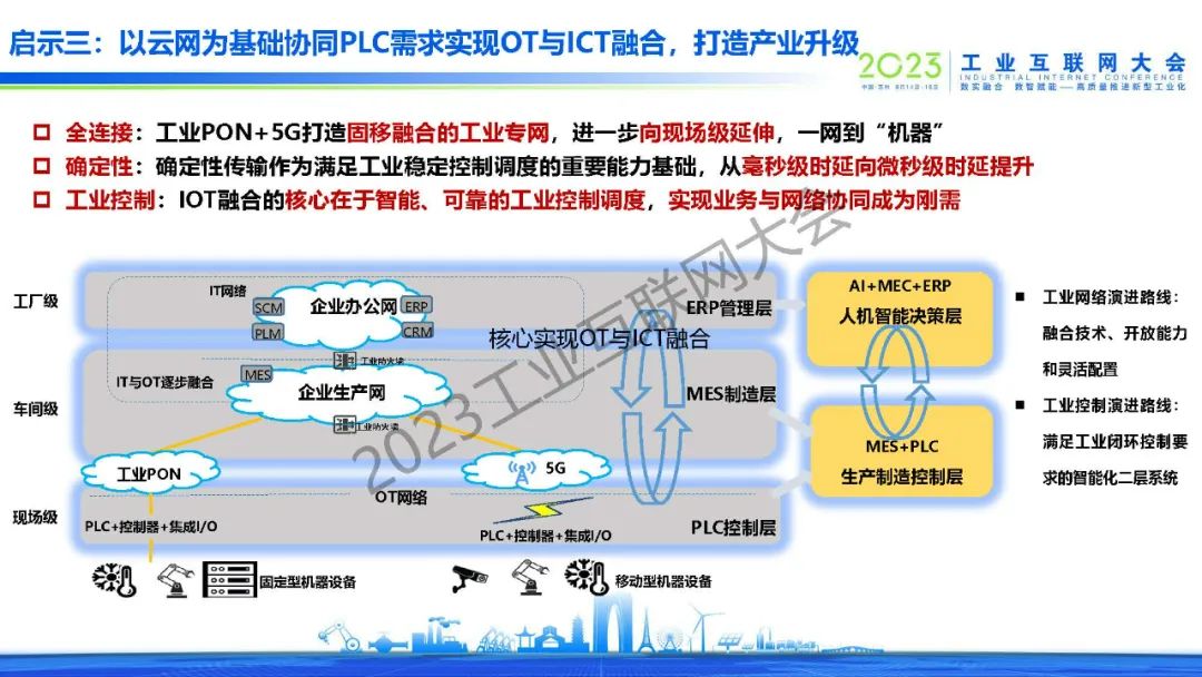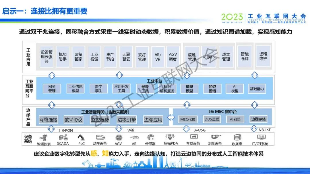 張東建議通過雙千兆連接,固移融合方式采集一線實時動態數據,積累數據價值,通過知識圖譜加載,實現感知能力,企業數字化轉型先從感、知能力入手,走向邊緣認知,打造云邊協同的分布式人工智能技術體系,以云網為基礎協同PLC需求實現OT與ICT融合,打造產業升級。