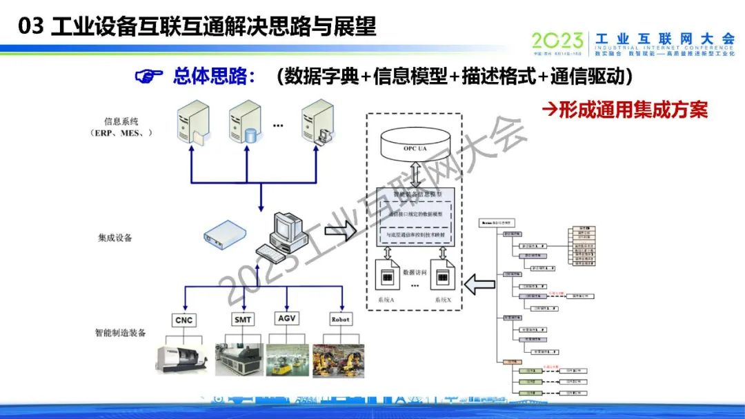 王麟琨表示,現(xiàn)場(chǎng)設(shè)備互聯(lián)互通是實(shí)施智能制造、工業(yè)互聯(lián)網(wǎng)的基礎(chǔ),互聯(lián)互通包含語(yǔ)義數(shù)據(jù)互聯(lián)互通,是提升工業(yè)數(shù)據(jù)利用率的關(guān)鍵。工業(yè)設(shè)備互聯(lián)互通解決思路是數(shù)據(jù)字典+信息模型+描述格式+通信驅(qū)動(dòng),從而形成通用集成方案。