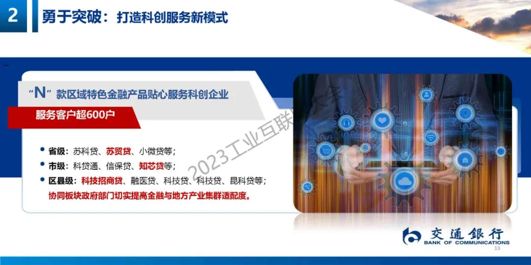 6月14日,在2023工業互聯網大會“工業互聯網產融推進論壇”上,交通銀行蘇州分行普惠金融事業部副總經理陳娟娟發表了《踐行“四敢精神”助力產業集群——“交銀科創 通達天下”科技金融產品路演》的主題演講。