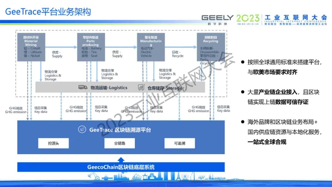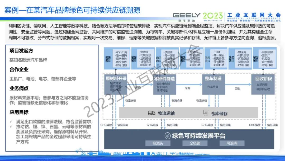 “利用區塊鏈、物聯網、人工智能等數字科技,結合碳方法學追蹤和管理碳排放,實現汽車供應鏈端到端全程監控,解決汽車供應鏈及碳排放的可追溯性、安全監管等問題。通過構建全網監督、共同維護的可信監管追溯鏈,為每輛車、關鍵零部件/材料建立唯一身份識別碼,并為其構建全生命周期不可篡改、分布式存儲的數據檔案,實現每一次交易、維修、理賠等關鍵數據都能被真實記錄和存儲,允許鏈上各參與方逆向查詢、追根溯源。”