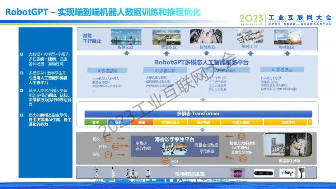 吳興貴指出,人工智能進(jìn)入新時(shí)代,特別是在通用人工智能 (AGI) 領(lǐng)域,多模態(tài)預(yù)訓(xùn)練大模型和強(qiáng)化學(xué)習(xí) 的出現(xiàn)使得人工智能應(yīng)用更加廣泛,同時(shí)生成 式 AI的興起也促進(jìn)了數(shù)字內(nèi)容的生產(chǎn)和創(chuàng)造, 即將迎來產(chǎn)業(yè)爆發(fā)。RobotGPT是多模態(tài)大模型賦能機(jī)器人實(shí)現(xiàn)端到端機(jī)器人數(shù)據(jù)訓(xùn)練和推理優(yōu)化。
