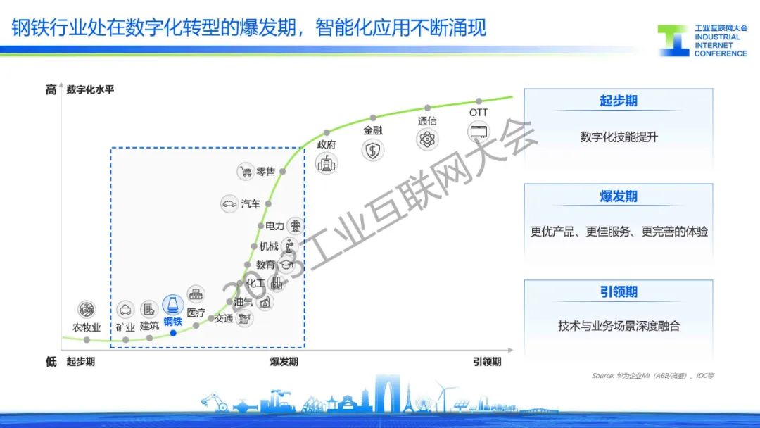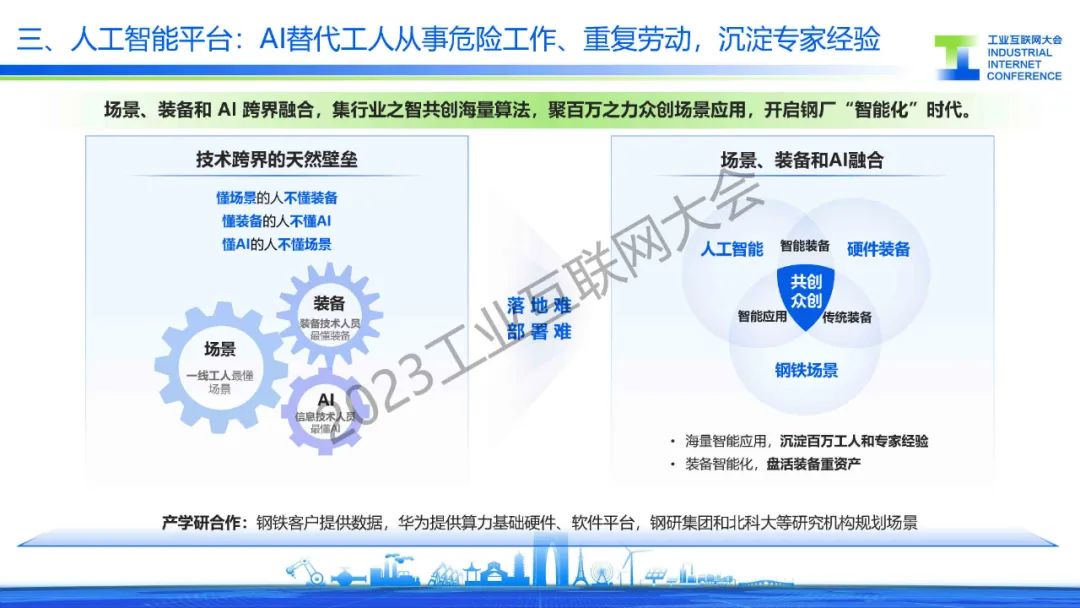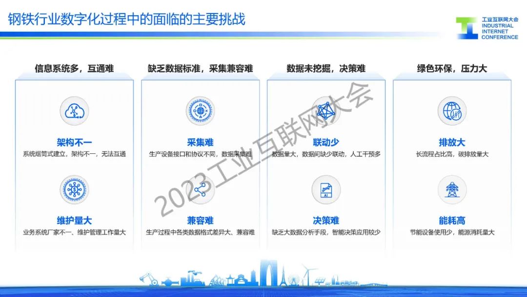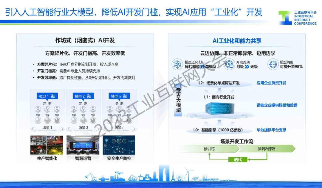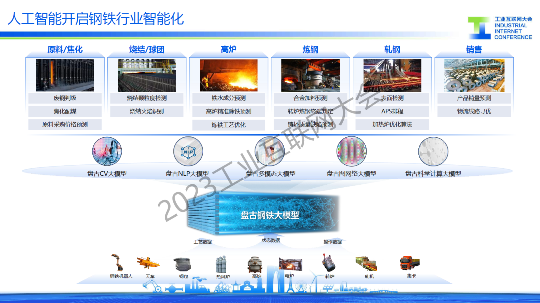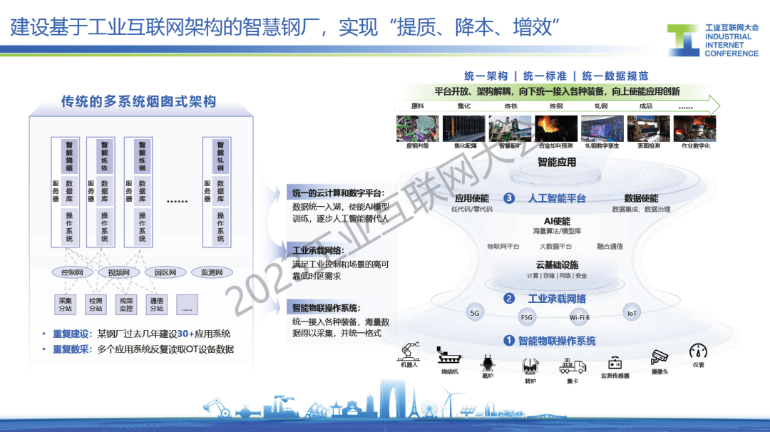 胡罡介紹,鋼鐵行業處在數字化轉型的爆發期,智能化應用不斷涌現,在這過程中還面臨著信息系統、數據標準和環保等主要挑戰。目前,通過建設基于工業互聯網架構的智慧鋼廠,來實現”提質、降本、增效“的目標,同時引入人工智能行業大模型,降低AI開發門檻,實現AI應用“工業化”開發,開啟鋼鐵行業智能化。