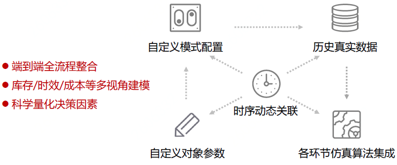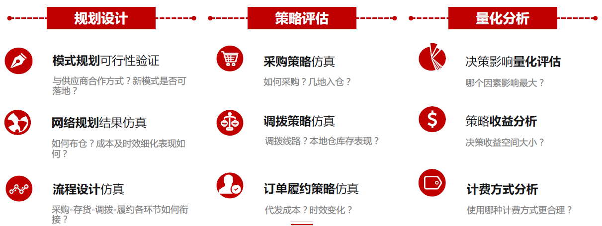 數字孿生供應鏈仿真平臺的核心能力主要分為三大方面,包括針對供應鏈的規劃設計、不同環節的策略評估、以及相應的量化分析,三大能力相互連接,由廣泛到精細。在規劃設計方面,主要涉及模式選擇、網絡規劃、倉網部署、全流程銜接的仿真等;在策略評估方面,包括各個供應鏈環節的策略的仿真模擬,用于指導供應鏈的計劃與執行;在量化分析方面,能夠對不同環節的決策因子進行分析,衡量策略的收益等。