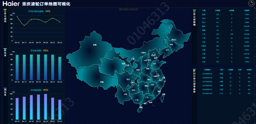 訂單可視化地圖顯示訂單完成率,這里曲線圖展示近7日訂單的完成率,并在曲線圖上面顯示近七日平均訂單完成率;發(fā)貨率展示近7日的成品發(fā)貨完成率,并在柱形圖上面顯示;柱形圖上面顯示近7日平均到貨率;訂單完成明細(xì)可以展示當(dāng)天到每個省級工貿(mào)地,各自的訂單應(yīng)發(fā)數(shù)和未發(fā)數(shù),以及發(fā)貨完成率。昨日訂單完成率報警展示昨日發(fā)貨完率不及100%的列表信息,從左到右列表:訂單編號、工貿(mào)、訂單數(shù)、已發(fā)和完后率。地圖訂單分布點擊或者光標(biāo)放置到中國地圖某個省份,會出現(xiàn)該省份當(dāng)日訂單發(fā)貨信息。例如,光標(biāo)放置到山東省,會自動彈出訂單發(fā)貨信息:訂單數(shù)、未發(fā)數(shù)和完成率。