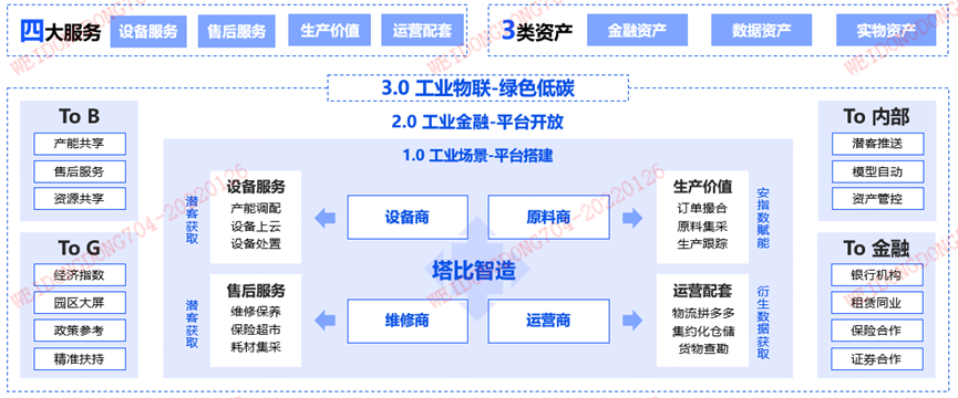 基于對中小微制造企業的熟悉,“塔比智造”平臺橫向以中小微企業成長過程為線索,覆蓋其產業升級、規模擴張中的固定資產新增需求以及營運資金配套需求;縱向以設備生命周期為線索,覆蓋設備采購、使用、轉讓等每個環節衍生出的企業經營管理需求,最終形成以設備為載體、以“塔比智造”平臺為依托,協同金融機構,解決中小微制造企業在每一次交易、使用、處置環節中的管理需求及融資需求,完成產業生態閉環。