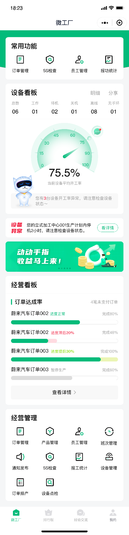 工廠整體設備開工率看板可主動推送當前設備的開工率及健康狀況,以紅亮箱包公司管理者為代表的中小微制造業企業主,可及時遠程了解工廠實際開工表現,從而可以更有目標性地進行產能優化,提高設備整體利用率。
