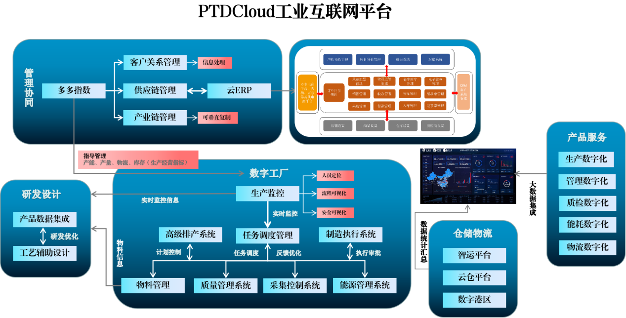 PTDCloud工業(yè)互聯網平臺服務于“交易、物流、倉儲、金融、生產”五個需求和“客戶、供應商、資金、設備、員工、產品”六個連接,旨在實現設備全量數據采集與生產全域數據整合,實現交易數字化、供應鏈數字化、管理數字化、生產數字化。